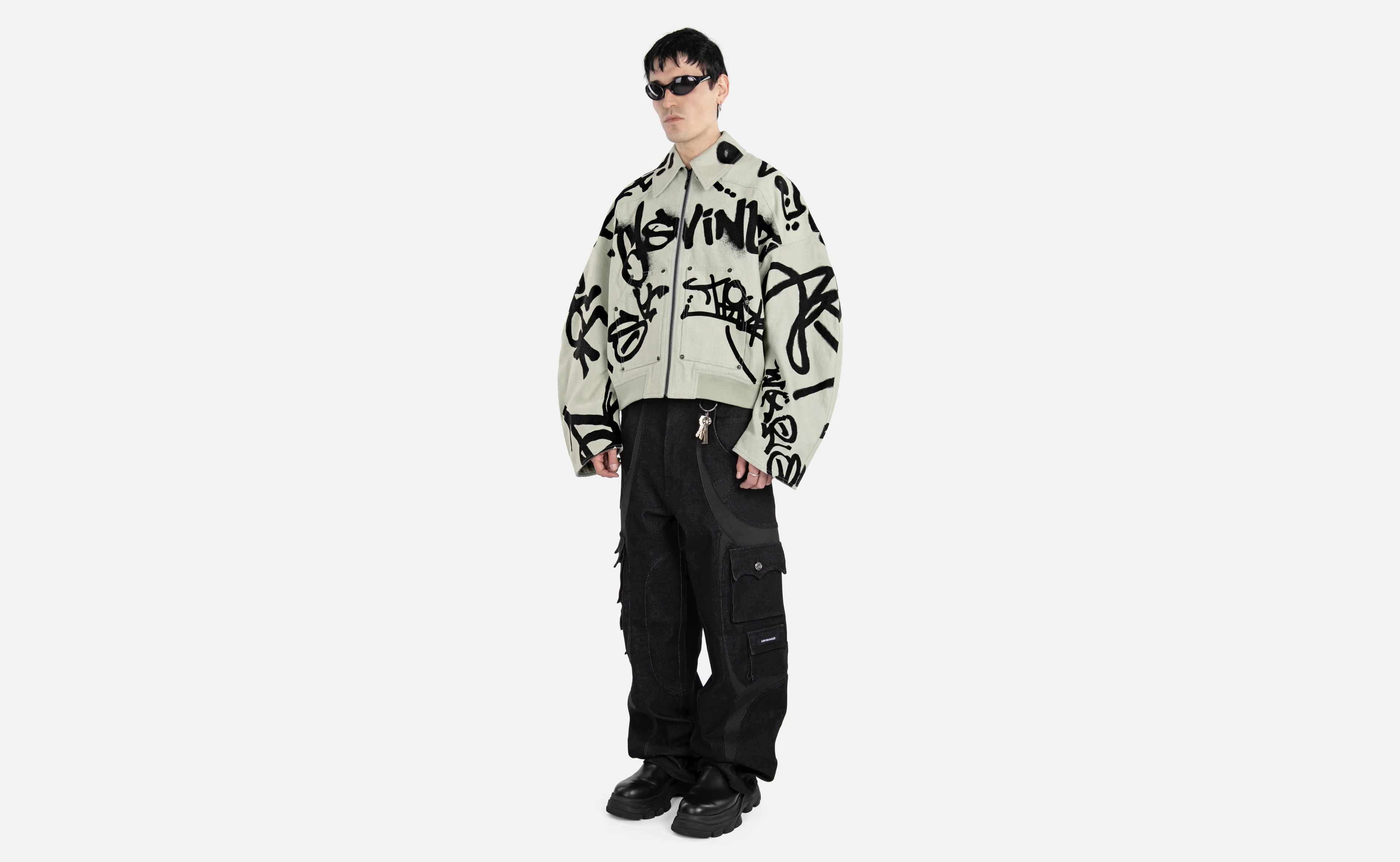A reinterpreted workwear classic elevated through structure and detail. Crafted from heavyweight blue-green tinted beige denim, with a sculpted sleeve silhouette and reinforced seams. The piece features a all-over graffiti print. Made from 340g structured yet comfortable denim.
