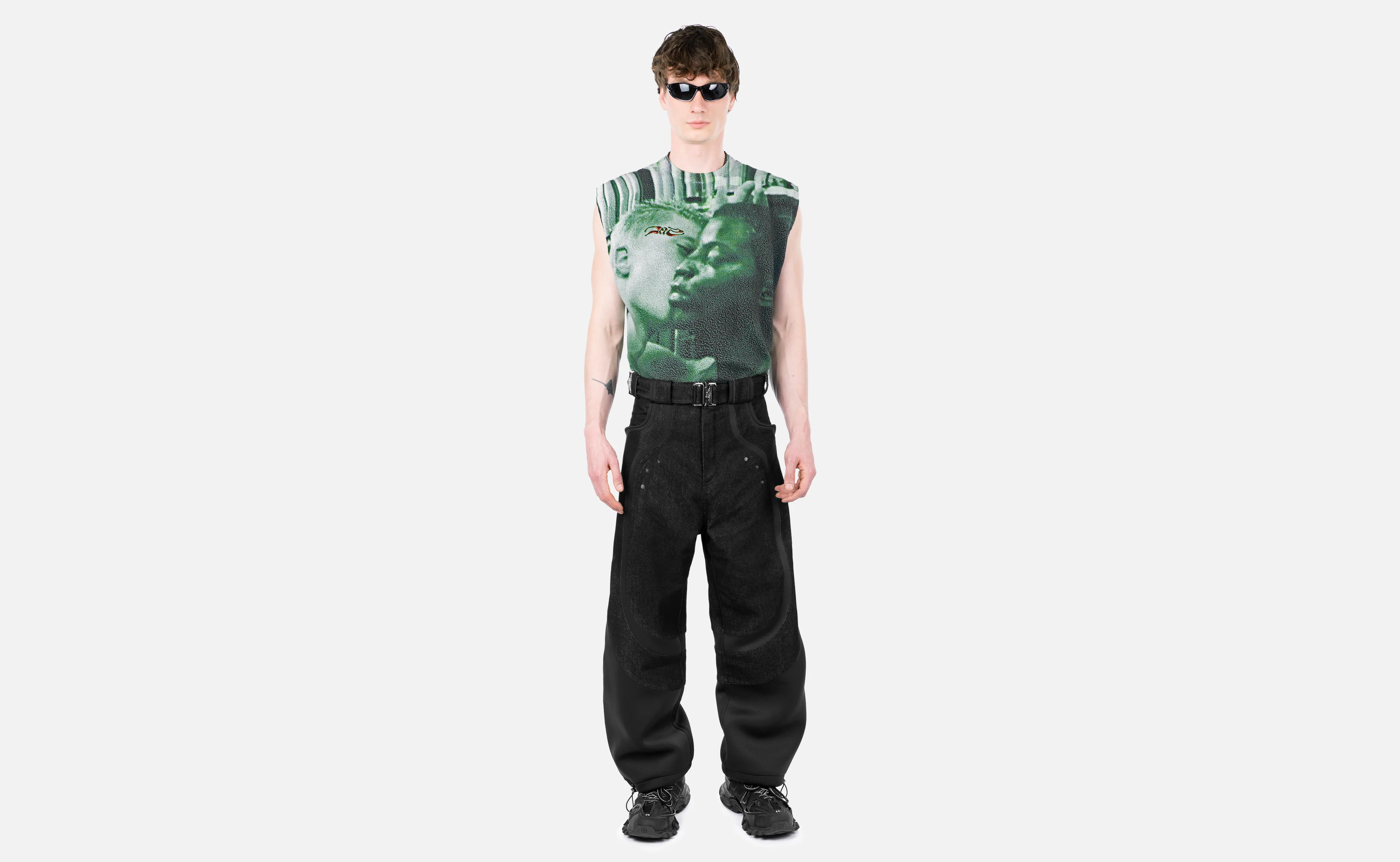 100% cotton knit tank top with full-scale digital print in a 90s green with a green/red iridescent 3D label.