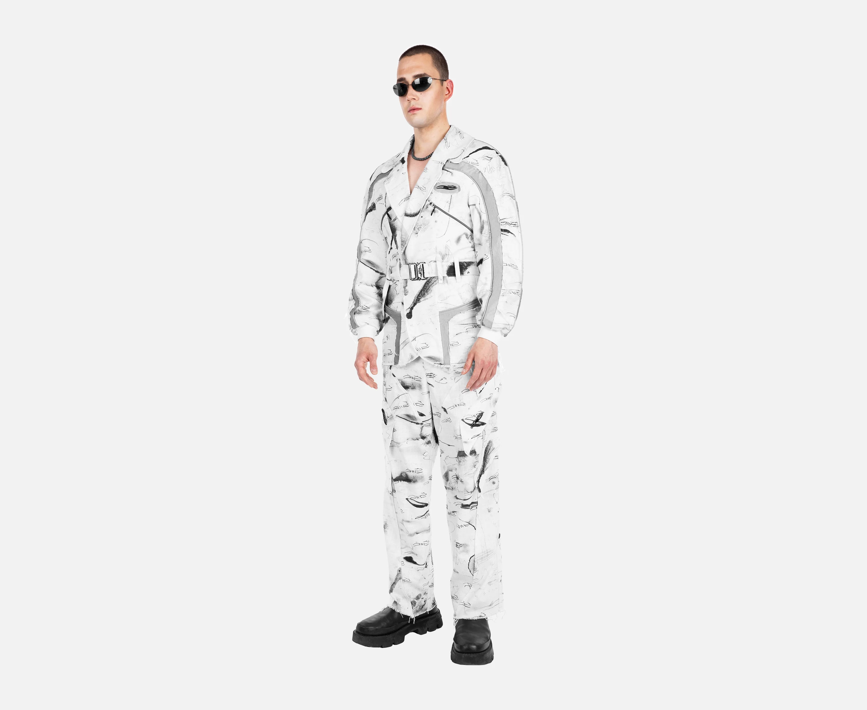 A tailored linen blazer featuring elegant raglan sleeves, intricate piping details, and sophisticated silver fabric accents. The jacket is distinguished by its raw hem finish and includes a belt for a refined silhouette. This versatile design pairs perfectly with matching shorts for a complete Krysvinczi look.